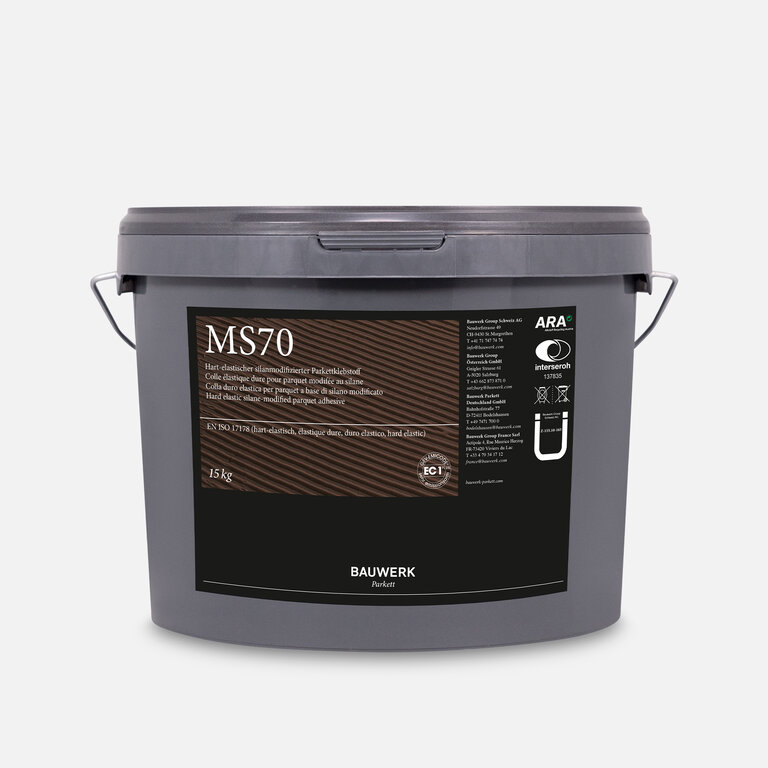 MS70 ist als wasser- und lösungsmittelfreier silanmodifizierter Klebstoff für die Verklebung von Bauwerk Parkett auf geeigneten und belegereifen Untergründen wie u.a. Calciumsulfat- oder Zementestrichen oder Verlegeplatten aus Holzwerkstoffen oder auf Calciumsulfatbasis geeignet. Universeller und leistungsstarker Klebstoff für die Verklebung auf schwierigen Untergründen und besonders großformatiger Parkettelemente. Ausgestattet mit der revolutionären Titanium Crosslinking Technologie zeigt der Klebstoff ein schnelles Abbinden mit sehr hoher Anfangshaftung. Die hart-elastische (nach ISO 17178) Einstellung mit verbesserter Scherfestigkeit garantiert ein perfektes Ergebnis über die Lebensdauer des Bodens. Die einfache Handhabung, der gute Riefenstand sowie das geringe Emissionsprofil machen MS70 zu einem Premium-Parkettklebstoff für die tägliche Anwendung.