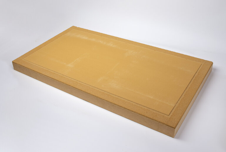 Einzige Lehmbauplatte mit integrierter Innendämmung durch 60 mm Holzweichfaserplatte als Trägerplatte und 10 mm Lehmputz