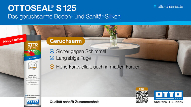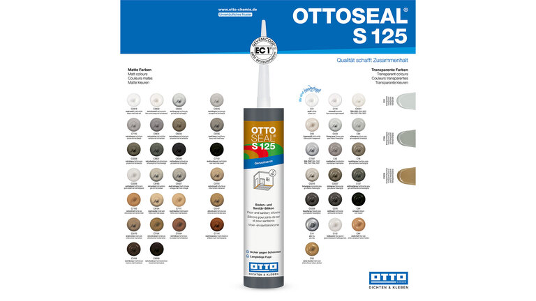 Das geruchsarme Boden- und Sanitär-Silikon OTTOSEAL® S 125 ist für verschiedene Anwendungen im Innen- und Außenbereich bestens geeignet. Sowohl bei Boden- und Anschlussfugen an Kunststoff- und Designbodenbelägen aus Gummi, Linoleum, Vinyl und PVC, als auch bei verschiedenen Anschlussfugen im Sanitärbereich, lassen sich mit OTTOSEAL® S 125 langlebige, schimmelbeständige Abdichtungen durchführen. Durch seine Verfügbarkeit in sehr vielen verschiedenen Farben sorgt der Silikon-Dichtstoff für ein stimmiges Gesamtbild. Zusätzlich ist OTTOSEAL® S 125 auch noch in matten Farbtönen verfügbar. Durch die ISEGA-Unbedenklichkeitserklärung ist OTTOSEAL® S 125 für den Einsatz im lebensmittelnahen Bereich geprüft und freigegeben und somit für diese Anwendungen perfekt geeignet.