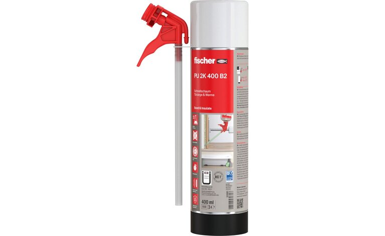fischer PU 2K 400 B2 zum Einbau von Türzargen, Dämmen und Füllen von Hohlräumen im Dach- und Wandbereich, Einschäumen von Sanitärelementen, Befestigen von Dämmelementen und Holzverkleidungen. Farbe hellblau. Allgemeines bauaufsichtliches Prüfzeugnis für B2. Der bewährte Mechanismus ermöglicht eine einfache, sichere Aktivierung der Komponenten. Schutzhandschuhe für Endverwender sind beigefügt.